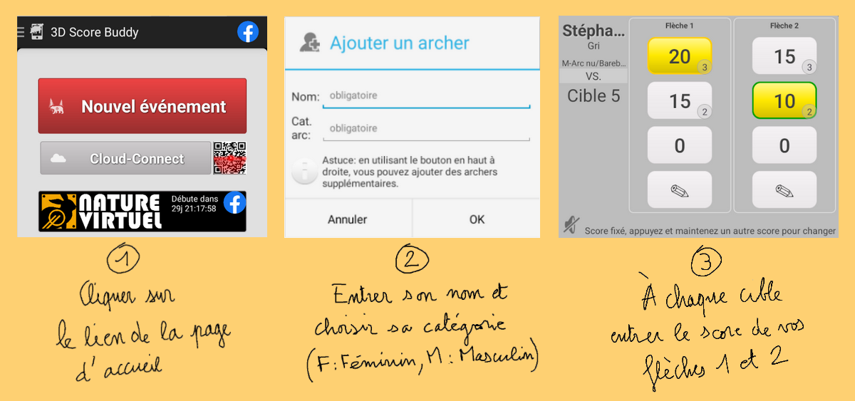 L’application 3D Score Buddy a été développée par Jürgen Weiß, un jeune archer allemand bien cool ! Cette app est gratuite et le mode Cloud-connect qu'elle propose a permis la réalisation de ce bel événement. Elle vous sera indispensable pour participer ! Cliquez sur l'image pour la télécharger sur le store Google ou Apple. 👉 Une fois que vous avez l'app, il ne vous reste qu'à suivre ces 3 étapes :