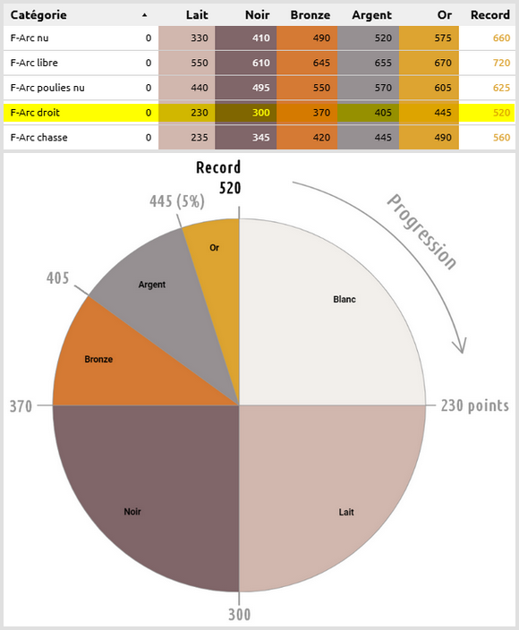 score de 0 à 230 (Blanc), 1 quart de 230 à 300 (Lait) et ainsi de suite. Le record de la saison dans cette catégorie est de 520 points sur 21 cibles. On ne trouve que 5% des performances entre 445 et 520 points : c’est
